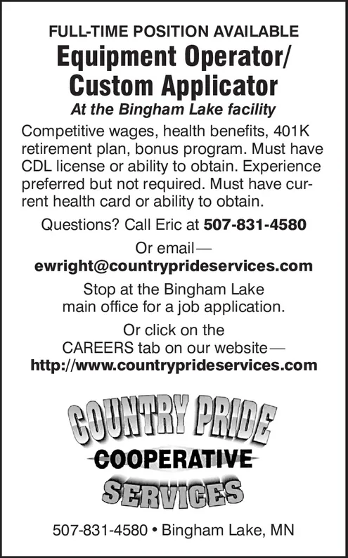 FULL-TIME POSITION AVAILABLE Equipment Operator/ Custom Applicator At the Bingham Lake facility Competitive wages, health benefits, 401K retirement plan, bonus program. Must have CDL license or ability to obtain. Experience preferred but not required. Must have cur- rent health card or ability to obtain. Questions? Call Eric at 507-831-4580 Or email- ewright@countryprideservices.com Stop at the Bingham Lake main office for a job application. Or click on the CAREERS tab on our website http://www.countryprideservices.com BOUNERY PRIDE COOPERATIVE SERVIGES 507-831-4580 Bingham Lake, MN FULL-TIME POSITION AVAILABLE Equipment Operator/ Custom Applicator At the Bingham Lake facility Competitive wages, health benefits, 401K retirement plan, bonus program. Must have CDL license or ability to obtain. Experience preferred but not required. Must have cur- rent health card or ability to obtain. Questions? Call Eric at 507-831-4580 Or email- ewright@countryprideservices.com Stop at the Bingham Lake main office for a job application. Or click on the CAREERS tab on our website http://www.countryprideservices.com BOUNERY PRIDE COOPERATIVE SERVIGES 507-831-4580 Bingham Lake, MN