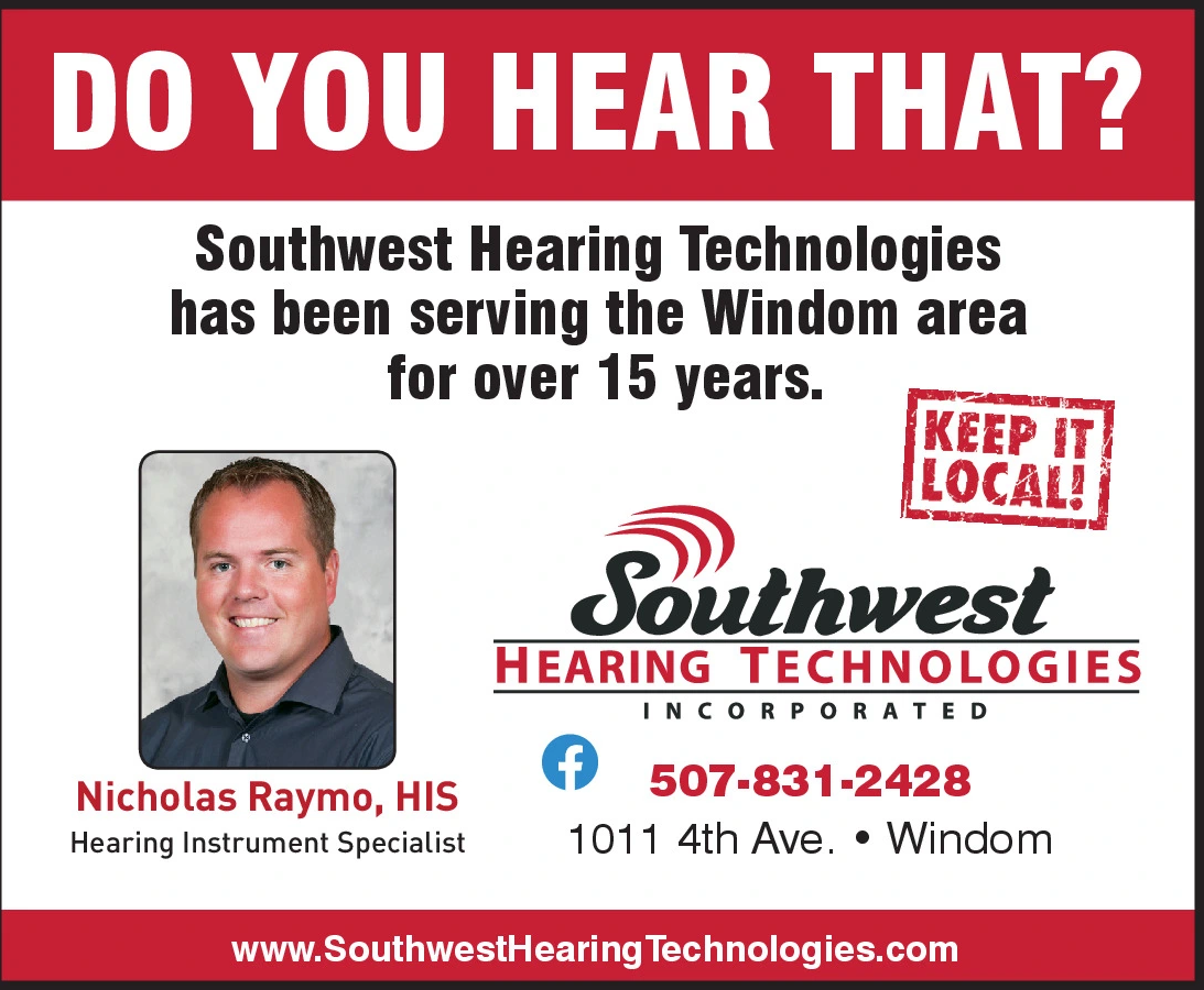 DO YOU HEAR THAT? Southwest Hearing Technologies has been serving the Windom area for over 15 years. Nicholas Raymo, HIS Hearing Instrument Specialist KEEP IT LOCAL! Southwest HEARING TECHNOLOGIES INCORPORATED f 507-831-2428 1011 4th Ave. Windom www.SouthwestHearing Technologies.com DO YOU HEAR THAT ? Southwest Hearing Technologies has been serving the Windom area for over 15 years . Nicholas Raymo , HIS Hearing Instrument Specialist KEEP IT LOCAL ! Southwest HEARING TECHNOLOGIES INCORPORATED f 507-831-2428 1011 4th Ave. Windom www.SouthwestHearing Technologies.com